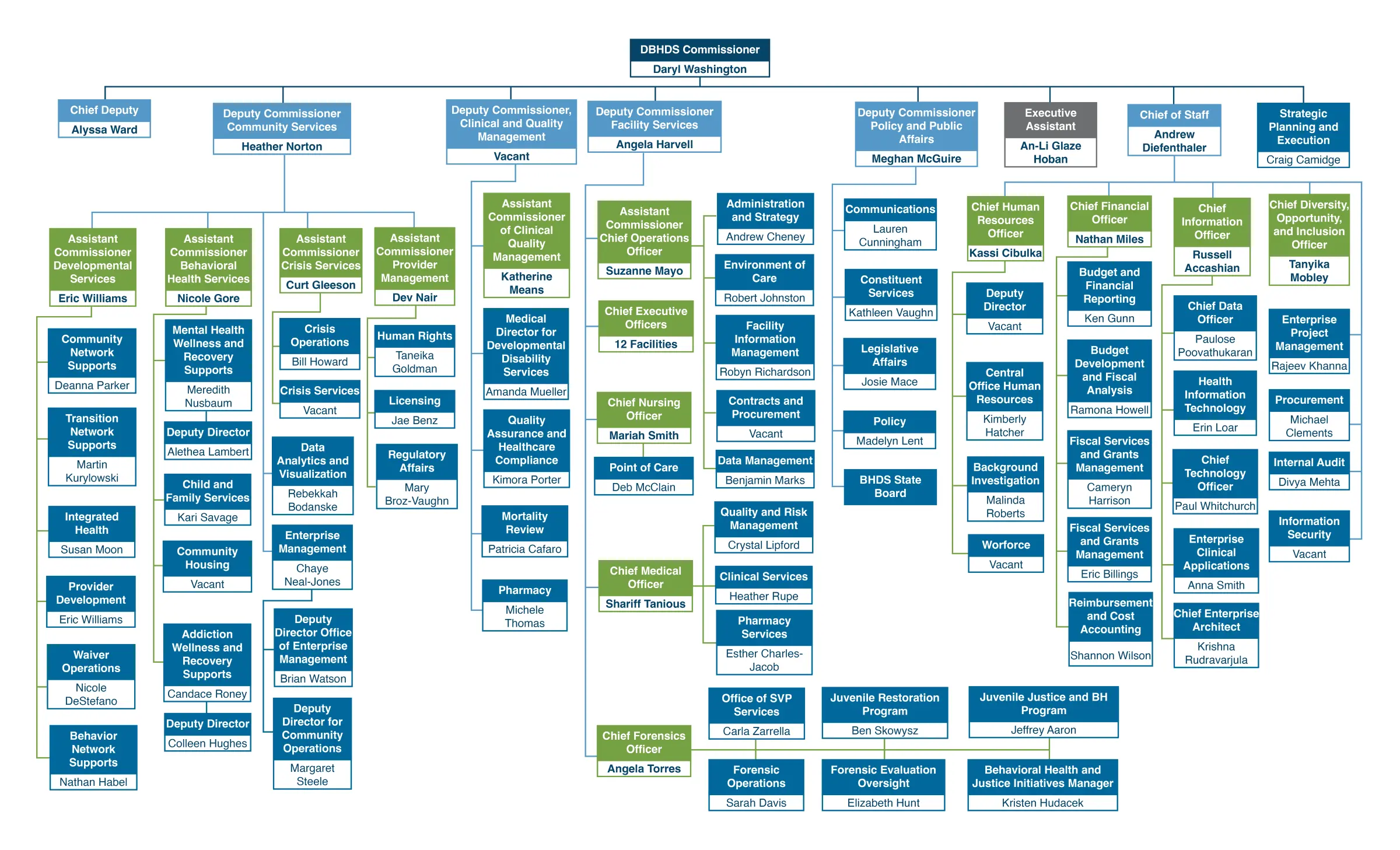 Cette section énumère les dirigeants du DBHDS qui soutiennent les opérations, la stratégie, le contrôle et les fonctions spécialisées à l'échelle du département.